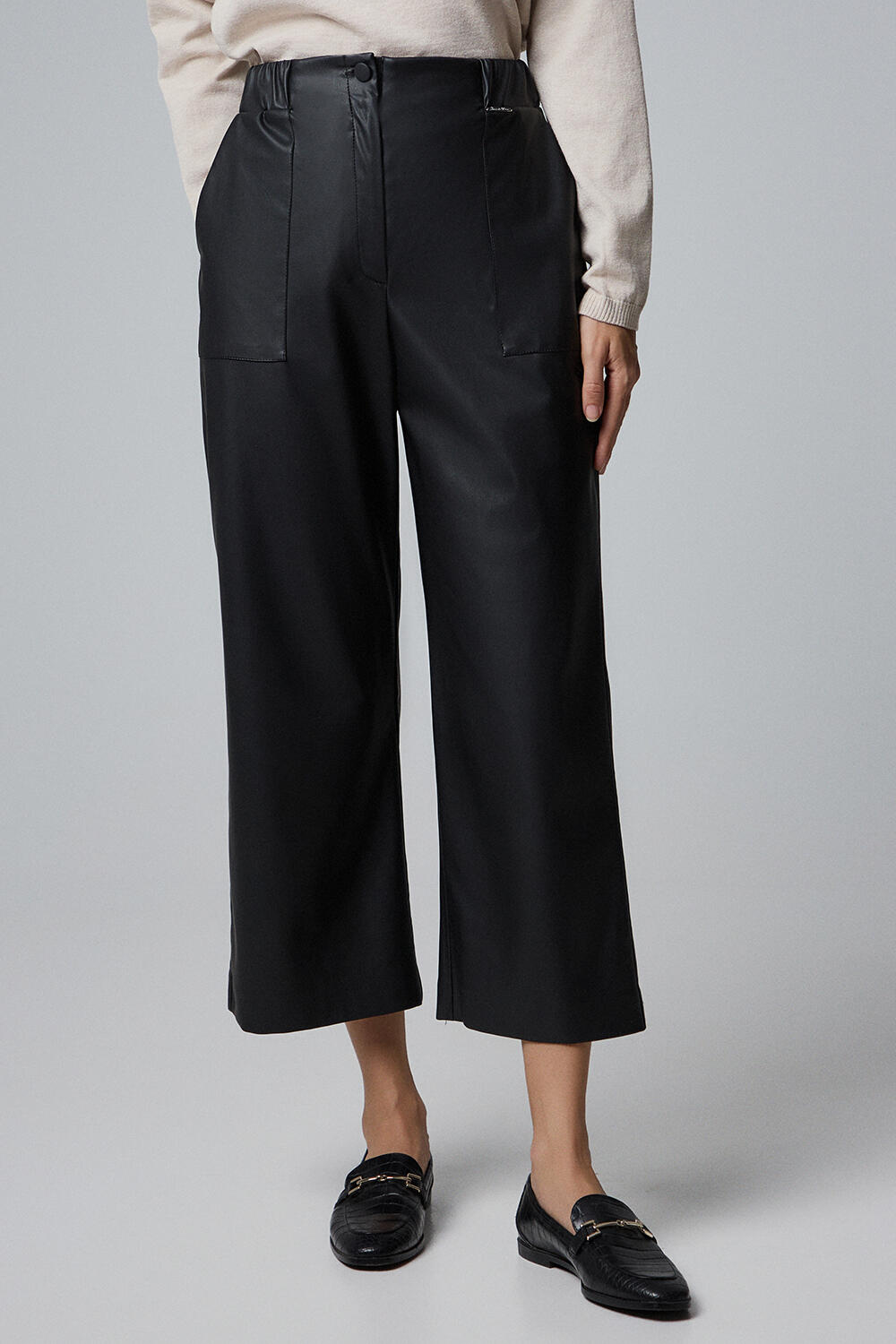 - Παντελόνι με υφή δέρματος, τσέπες μπροστά,λάστιχο στη μέση, κλείσιμο με φερμουάρ και κουμπί .