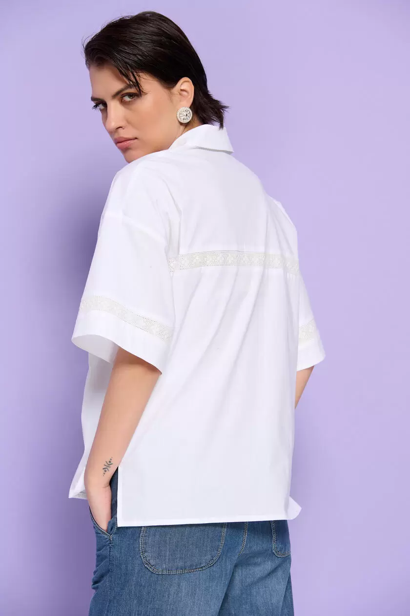 - Πουκάμισο βαμβακερό με γιακά σε κανονική γραμμή, κοντομάνικο, με κεντητές λεπτομέρειες στο μπροστινό μέρος και στα μανίκια.