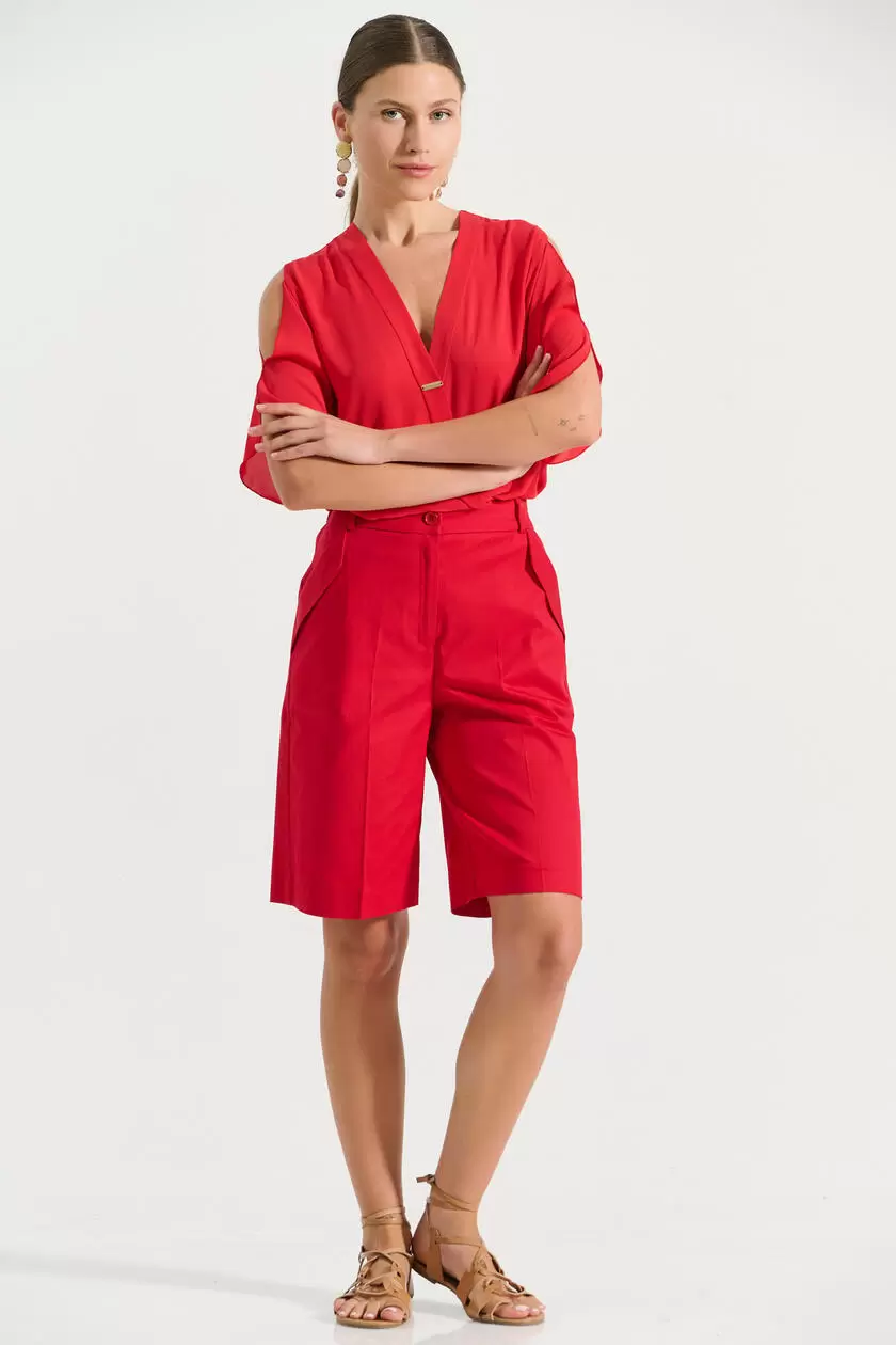 - Βερμούδα βαμβακερή σε ίσια γραμμή με λοξές τσέπες στο πλάι.