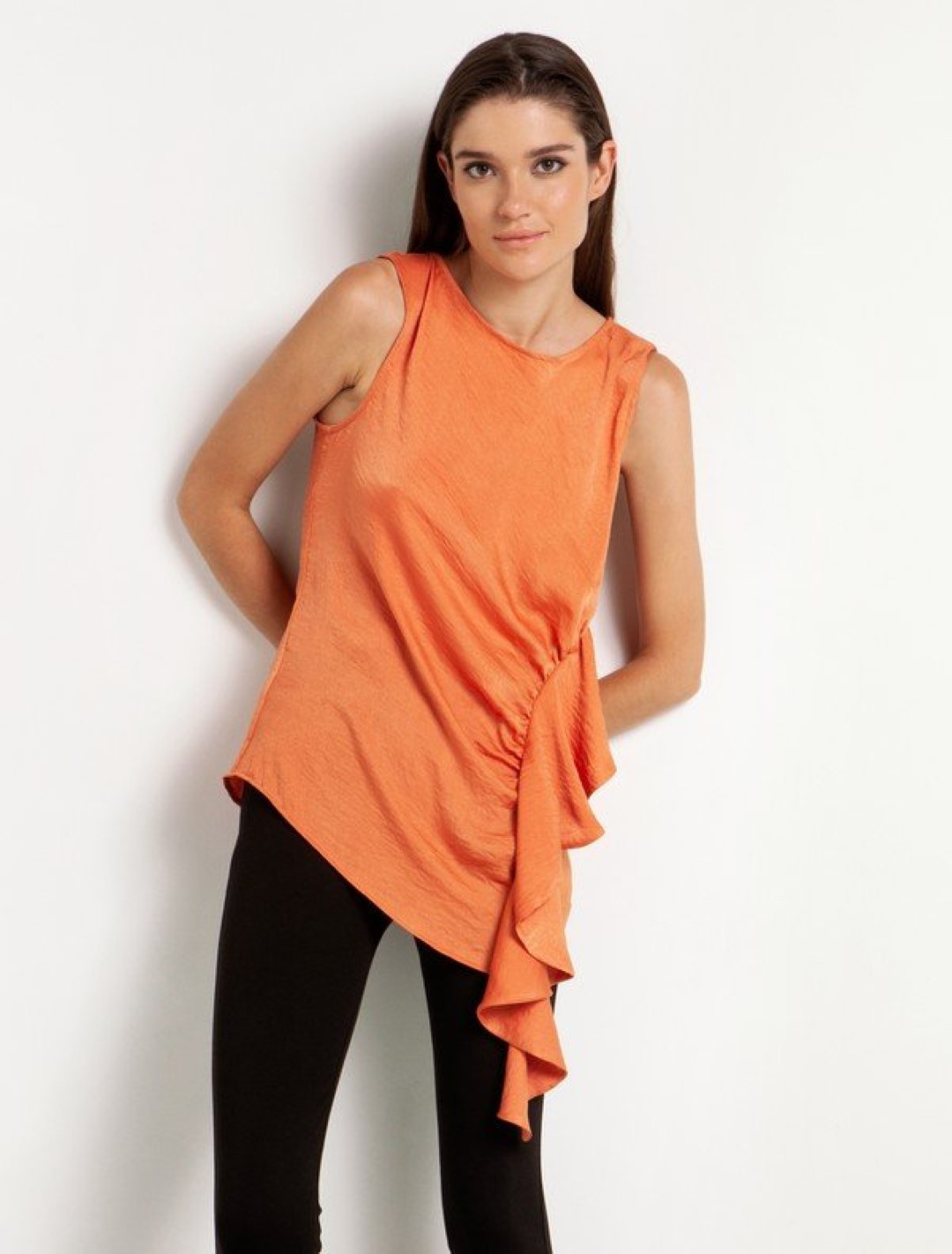 • Αμάνικο τοπ σατινέ με βολάν στο πλαϊνό μέρος