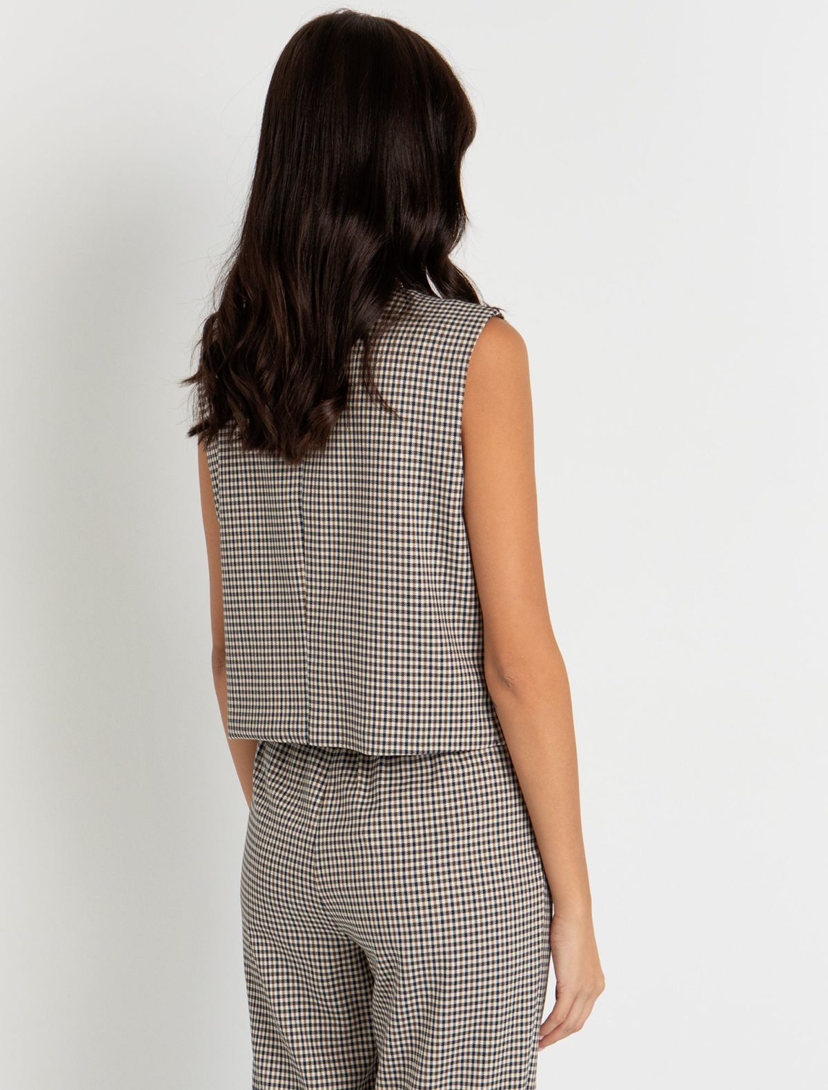 - Αμάνικο γιλέκο σε κλασικό σχέδιο με καρό pattern σε γήινους τόνους & V λαιμόκοψη.