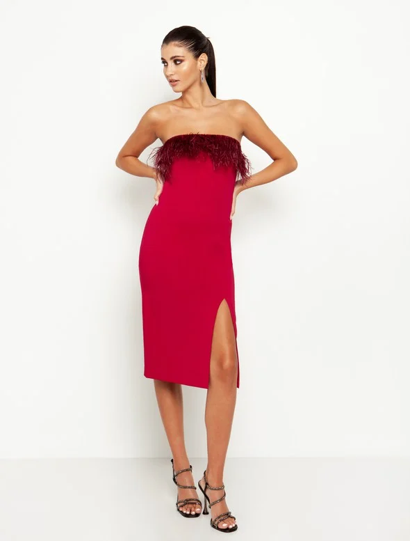 - Ντεκολτέ διακοσμημένο με απλικέ ασορτί φτερά.