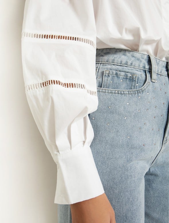 - Γιακάς & φουσκωτά μανίκια με πιέτες & διάτρητη ύφανση στο τελείωμα.