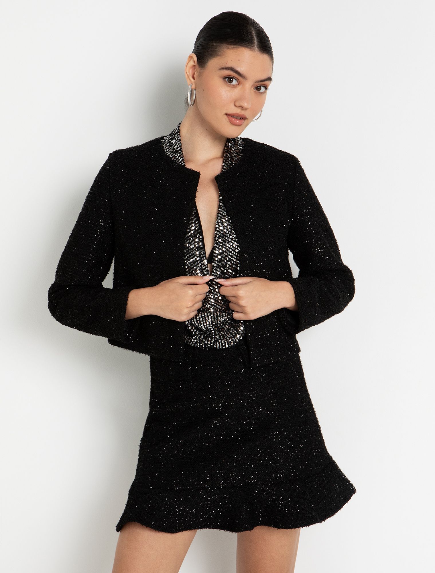 - Ανοιχτό σακάκι με ανάγλυφη πλέξη & σχέδιο ύφανσης με ασημί μεταλλόνημα.