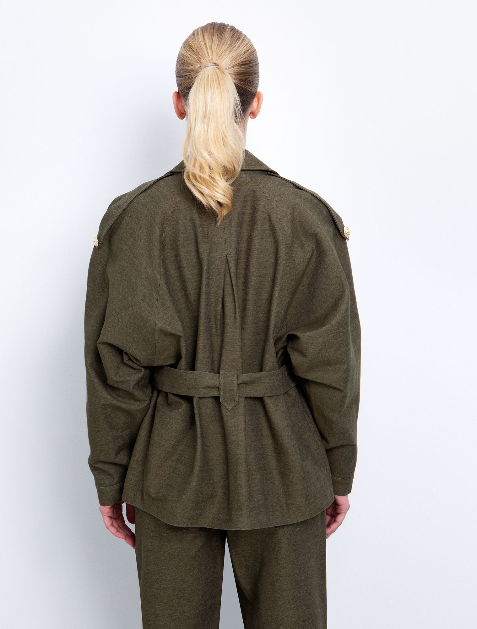• Tabs στους ώμους με χρυσά ανάγλυφα κουμπιά.