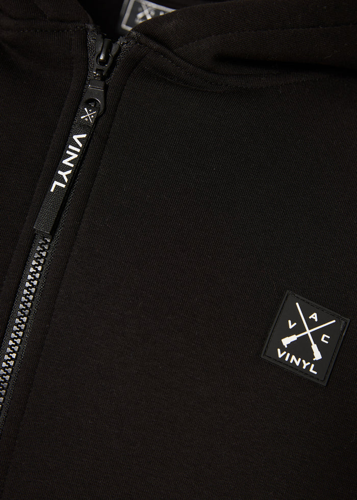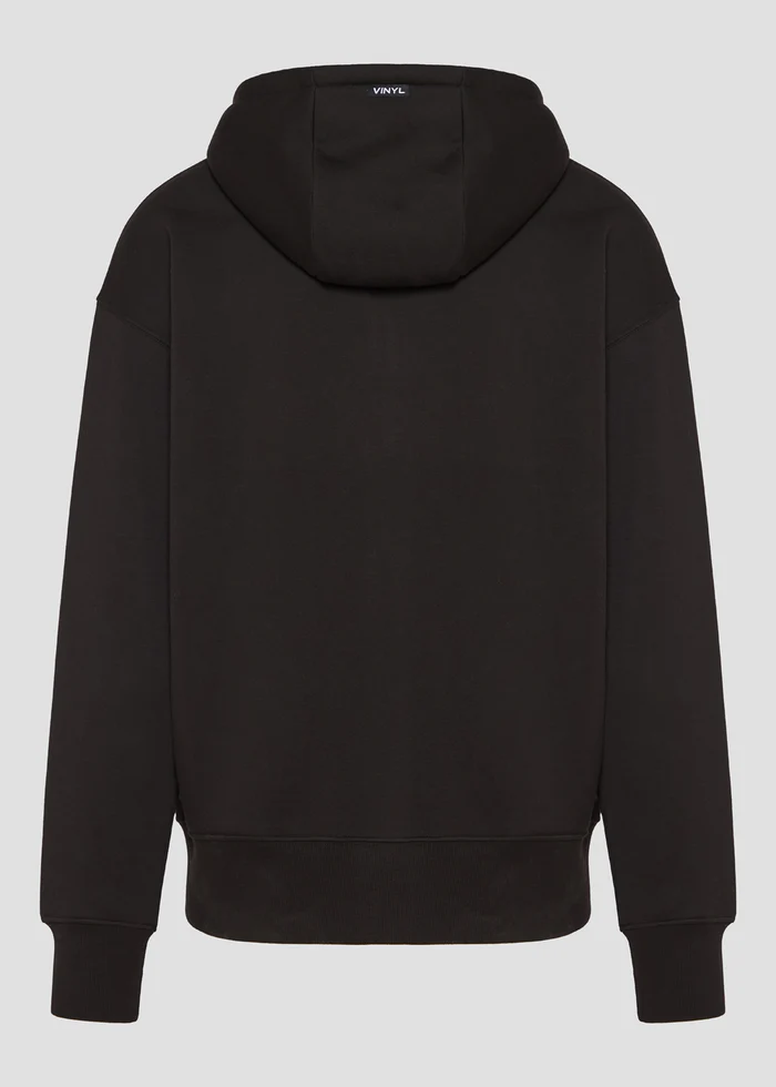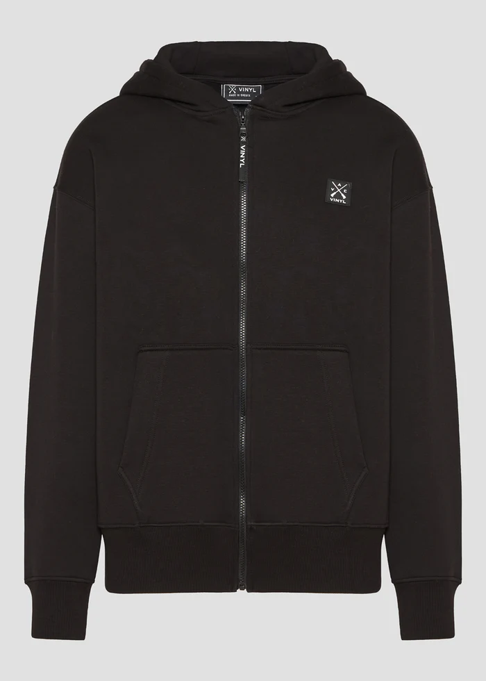 Ζακέτα μαύρη με ριπ τελείωμα στο τέλος και χωρίς κορδόνι στην κουκούλα. Διαθέτει δυο πλαϊνές τσέπες και διακοσμητικό λουράκι με το λογότυπο στο φερμουάρ.